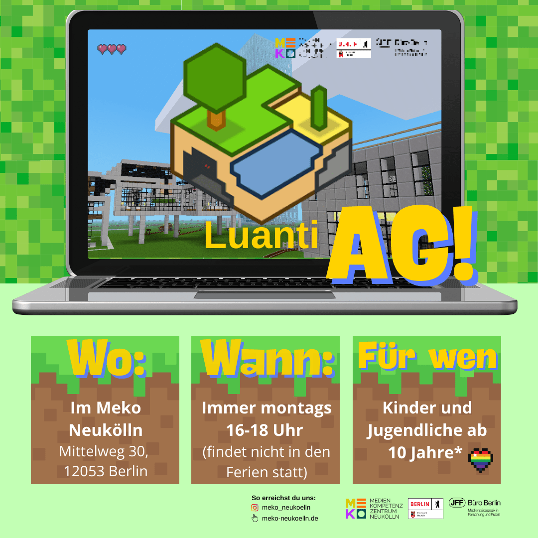 Luanti (früher Minetest) ist ein kostenloses Open-Source-Computerspiel, das ähnlich wie Minecraft funktioniert. Es ist ein Sandbox-Spiel, bei dem Spieler*innen in einer voxelbasierten, blockartigen Welt bauen. Minetest unterstützt Mods, sodass die Spielwelt und Funktionen erweitert werden können. Interesse? Komm vorbei!