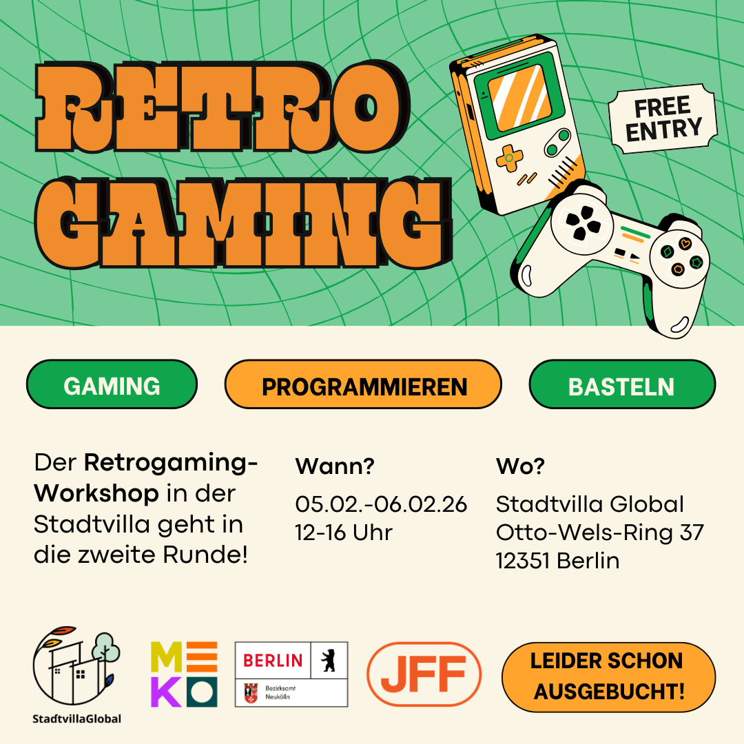 Weil es beim letzten Mal so viel Spaß gemacht hat, findet der Retrogaming-Workshop in der Stadtvilla nun schon zum zweiten Mal statt. In den Winterferien basteln und programmieren wir eigene Gameboys und tauchen in die Welt der Retro Spiele ein. Der Workshop ist ausgebucht und wir freuen uns auf eine tolle Zeit mit euch!